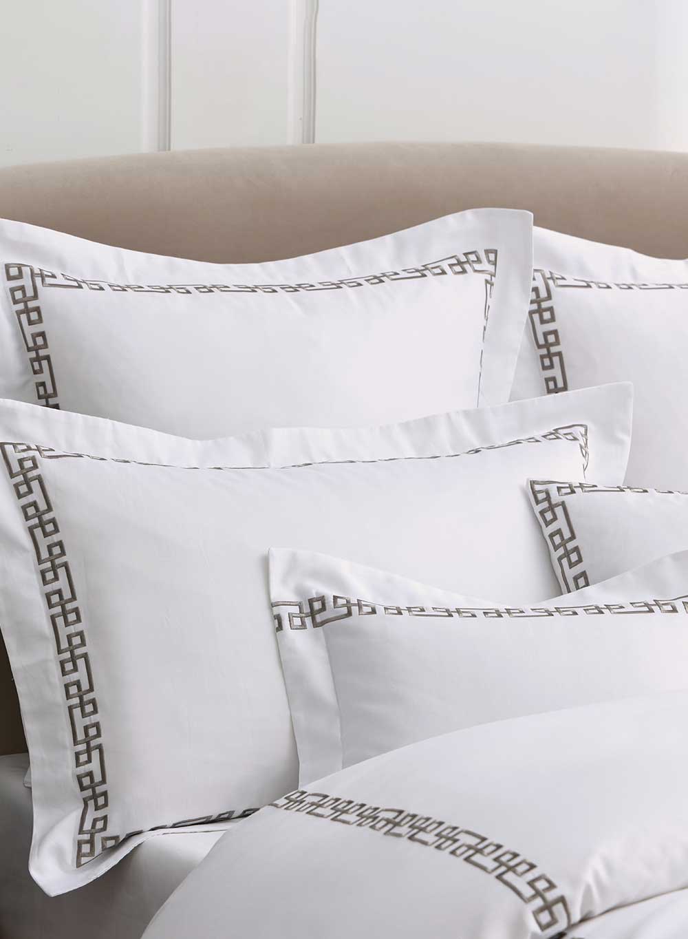 A stylish embroidered border, on 500tc Egyptian cotton. Ares is a contemporary and modern design, available in Oak and Champagne. The Ares design matches perfectly with the MUIR Turner embroidered velvet accessories. Nothing beats a crisp hotel bed made up of white cotton linen. REAL 5 STAR Hotel bed linen.