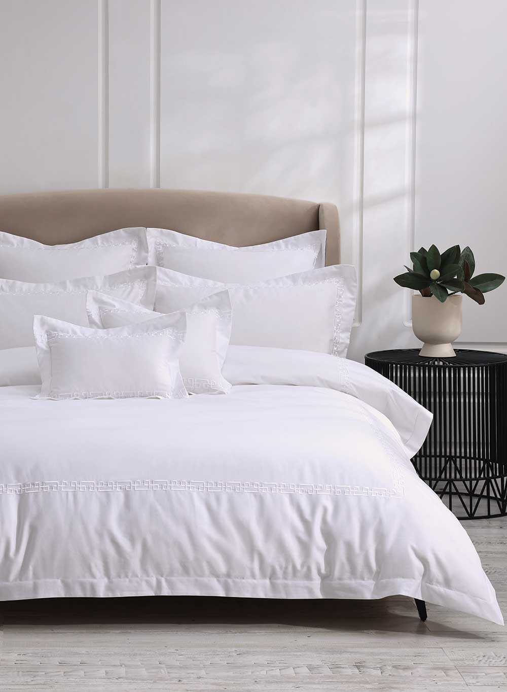 A stylish embroidered border, on Luxury Hotel Quality 500tc Egyptian cotton. Ares is a contemporary and modern design, available in Oak and Champagne. The Ares design matches perfectly with the MUIR Turner embroidered velvet accessories. Nothing beats a crisp hotel bed made up of white cotton linen. REAL 5 STAR Hotel bed linen.