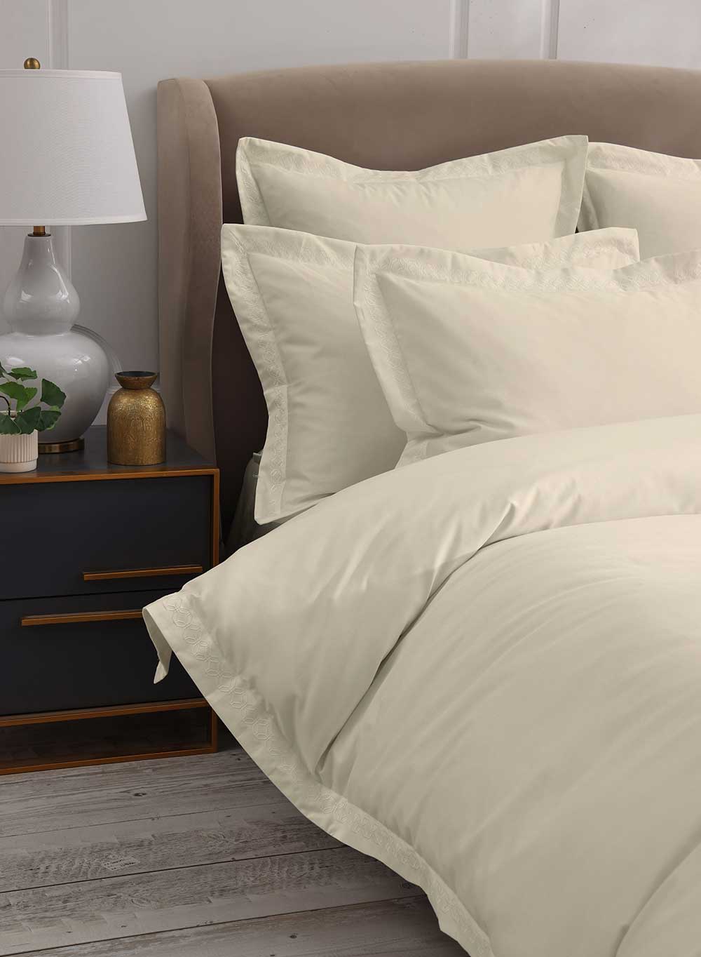 Cavendish is embroidered with a stylish tile pattern, inspired by Marrakech, and is finished with an oxford border. Muir Cavendish is also available in white and ivory, on a 300tc cotton sateen base.