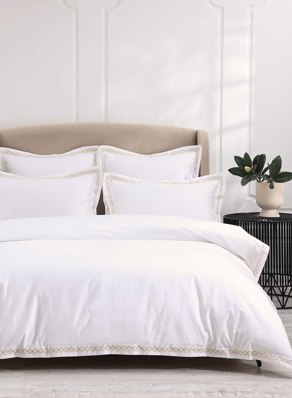 Cavendish is embroidered with a stylish tile pattern, inspired by Marrakech, and is finished with an oxford border. Muir Cavendish is available in white and ivory, on a 300tc cotton sateen base.