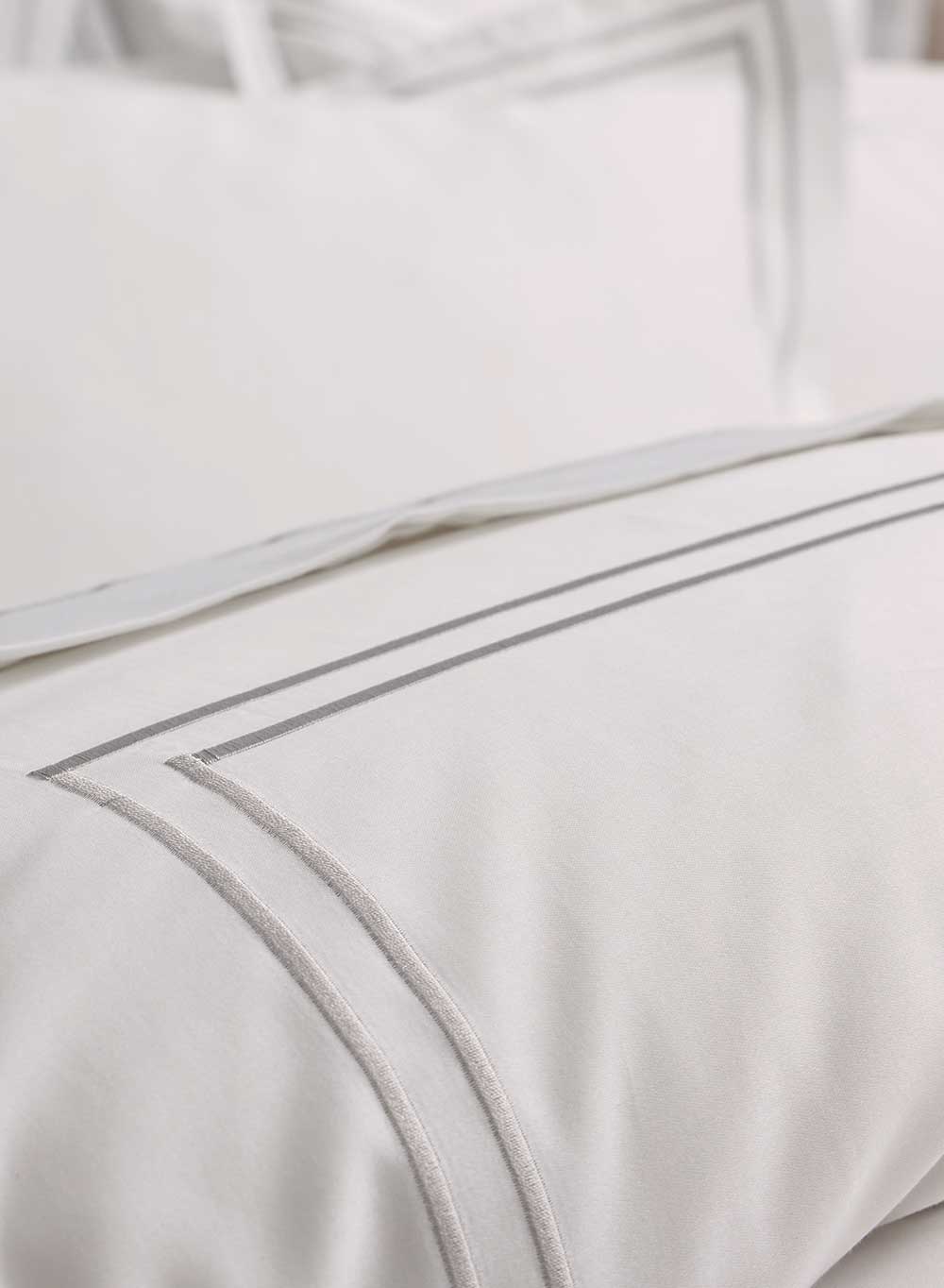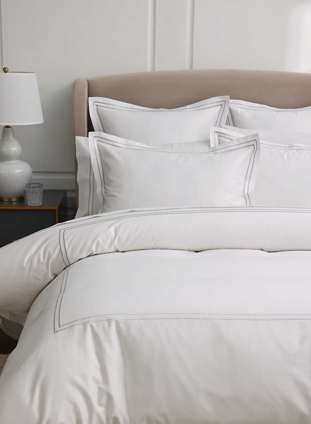 The MUIR empire Luxury Hotel Quality collection is 500tc Egyptian cotton sateen, with a double row of perfectly embroidered satin stitch border. Empire is available in white with either Silver or Champagne stitching. Empire is the perfect bedding to create the luxury hotel bedroom and bathroom. Nothing beats a crisp hotel bed made up of white cotton linen. REAL 5 STAR Hotel bed linen.